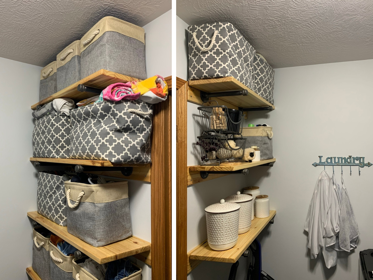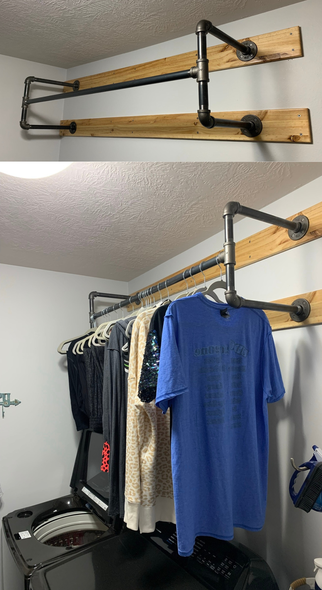 A custom black iron pipe clothing rack above the washer/dryer paired with warm wood shelving—creating a sleek, industrial-organized focal point that elevates the entire laundry room.