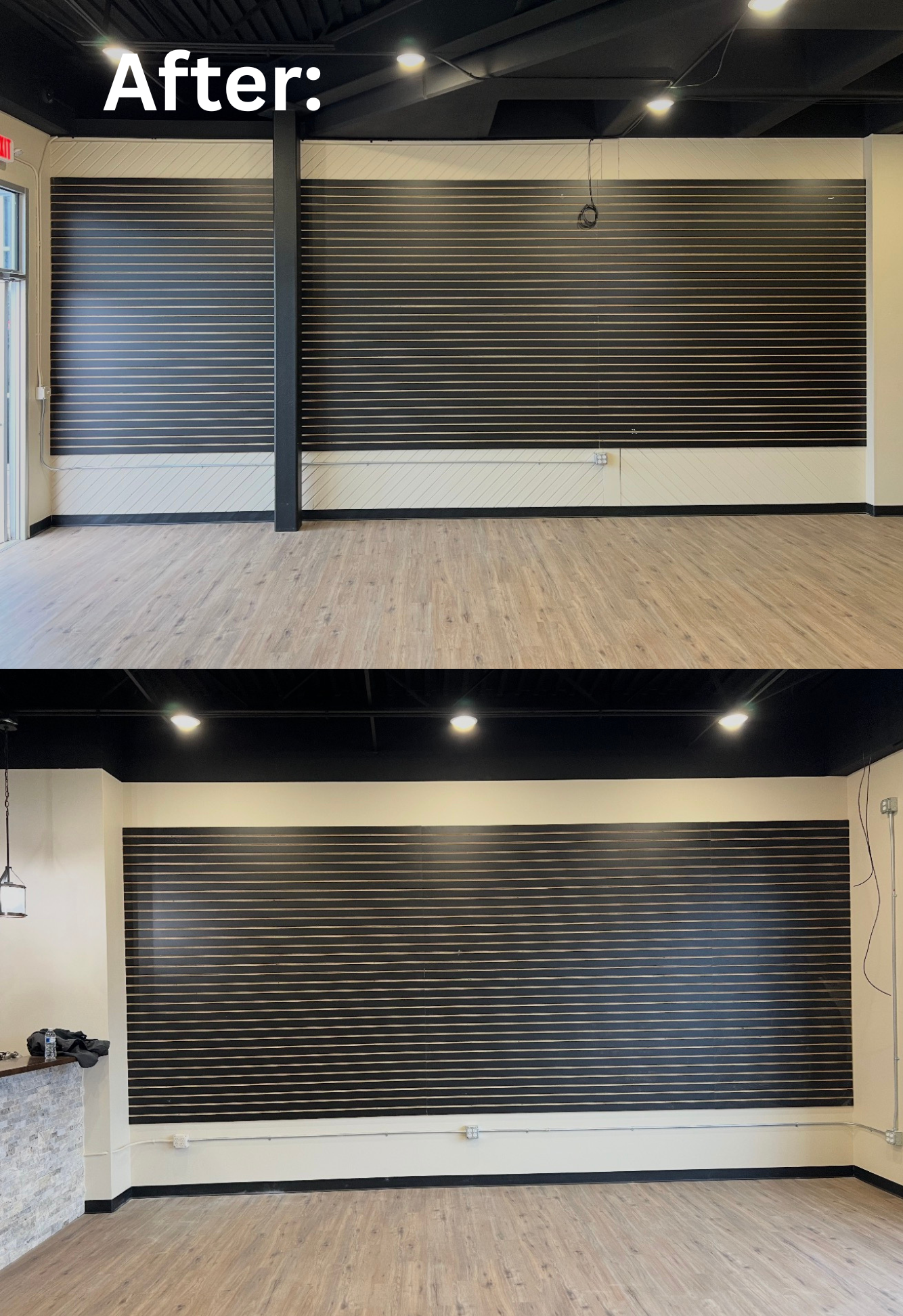 A bold slatwall installation with dark horizontal paneling—creating a modern, high-impact backdrop that transforms the entire retail space into a polished, professional showcase.